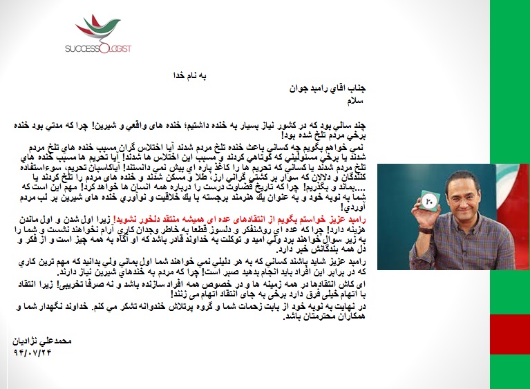 قدردانی از رامبد جوان به خاطر برنامه خندوانه دکتر محمدعلی نژادیان Send an email 24 مهر 1394 21:51 کمتر از یک دقیقه محمدعلی نژادیان- قدردانی از رامبد جوان دکتر محمدعلی نژادیان Send an email 24 مهر 1394 21:51 کمتر از یک دقیقه اشتراک گذاری فیس بوک X لینکدین واتس آپ تلگرام اشتراک گذاری از طریق ایمیل چاپ