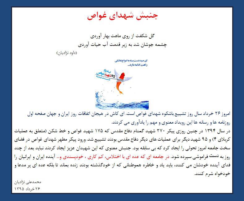 جنبش شهداي غواص فراموش نشود! دکتر محمدعلی نژادیان Send an email 25 خرداد 1395 23:38 کمتر از یک دقیقه محمدعلي نژاديان دکتر محمدعلی نژادیان Send an email 25 خرداد 1395 23:38 کمتر از یک دقیقه اشتراک گذاری فیس بوک X لینکدین واتس آپ تلگرام اشتراک گذاری از طریق ایمیل چاپ