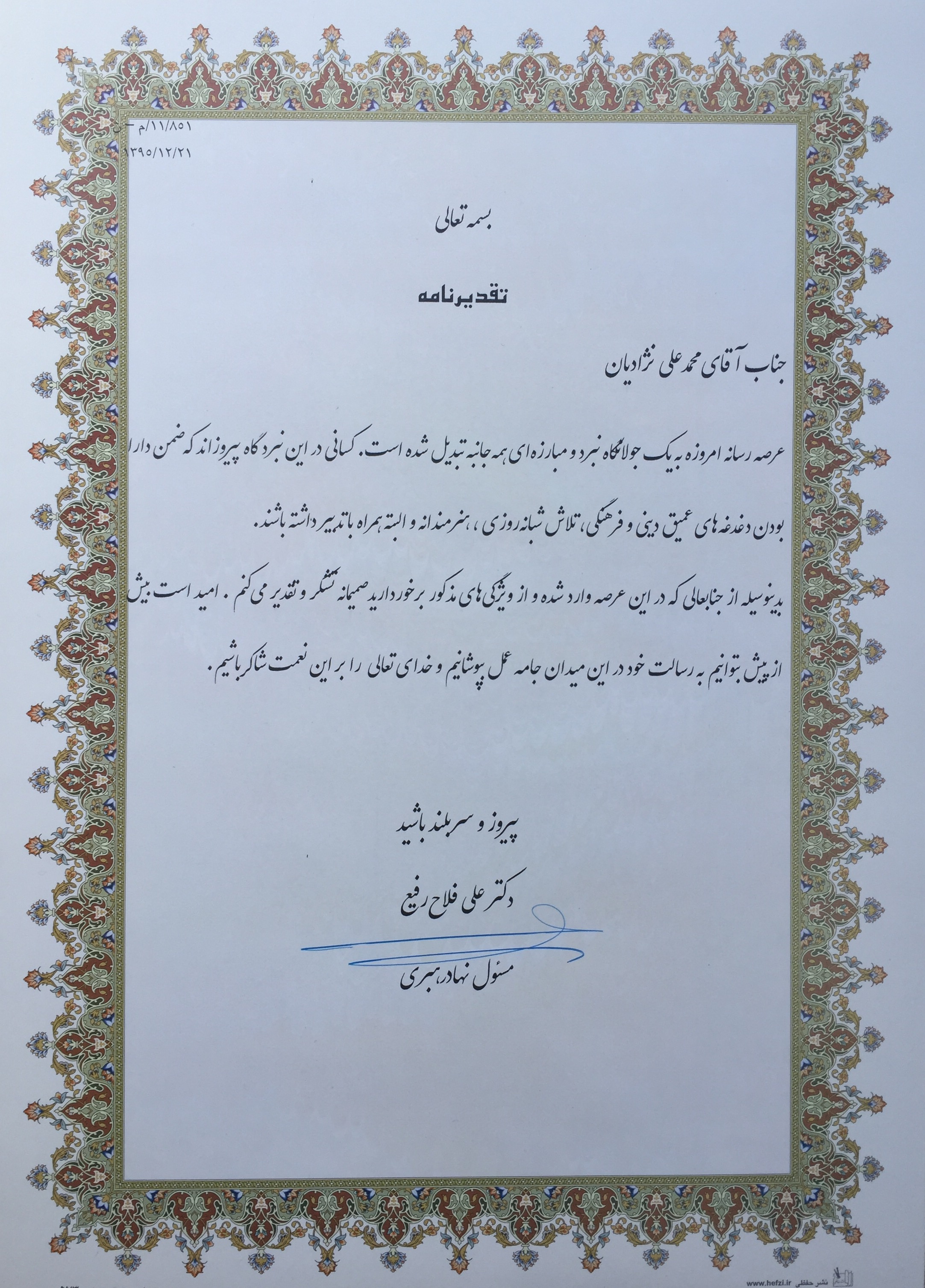 تقدير (نهاد رهبري) در (دانشگاه تربيت مدرس) از محمدعلي نژاديان دکتر محمدعلی نژادیان Send an email 23 اسفند 1395 02:27 کمتر از یک دقیقه محمدعلي نژاديان دکتر محمدعلی نژادیان Send an email 23 اسفند 1395 02:27 کمتر از یک دقیقه اشتراک گذاری فیس بوک X لینکدین واتس آپ تلگرام اشتراک گذاری از طریق ایمیل چاپ