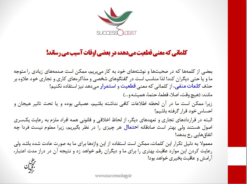 بعضی از كلمهها كه در صحبتها و نوشتههاى خود به كار مىبريم، ممكن است صدمههاى زيادى را متوجه ما و يا حتى ديگران كند! لذا مناسب است در گفتگوهاى شخصى و مذاكرههاى كارى و تجارى خود علاوه بر حذف كلمات منفى، از كلماتى كه معنى قطعيت و استمرار مىدهد نيز استفاده نكنيم!